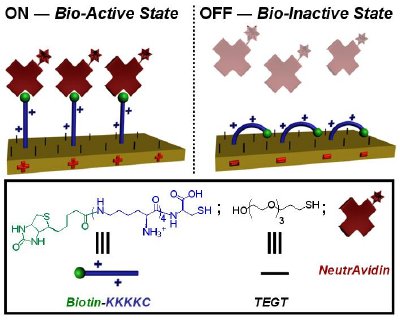 This system is based upon the conformational switching of positively charged oligolysine peptides that are tethered to a gold surface, such that bioactive molecular moieties - biotin - incorporated on the end of the oligolysines can be exposed (bio-active state) or concealed (bio-inactive state) on demand (Figure 2), as a function of surface potential. The oligolysine peptides exhibit protonated amino side chains at pH =7, providing the basis for the switching "On" and "Off" of the biological activity on the surface.