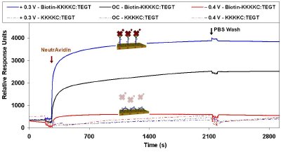 Apart from ensuring sufficient spatial freedom for synergistic molecular reorientation of the surface-bound biotinylated peptide, the short oligo(ethylene glycol) groups prevent nonspecific interaction from the proteins. As a control, a two-component, mixed SAM was also prepared using TEGT and a peptide without the biotin moiety - KKKKC. The dynamics of switching the biological properties was studied by observing the binding events between biotin and fluorescently labeled NeutrAvidin.